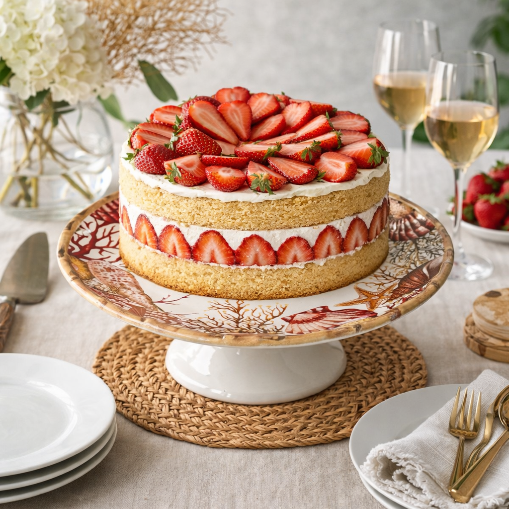 Boleira de Cerâmica com estampa marinha — adornada por conchas, estrelas-do-mar e delicados corais em tons de vermelho e areia.