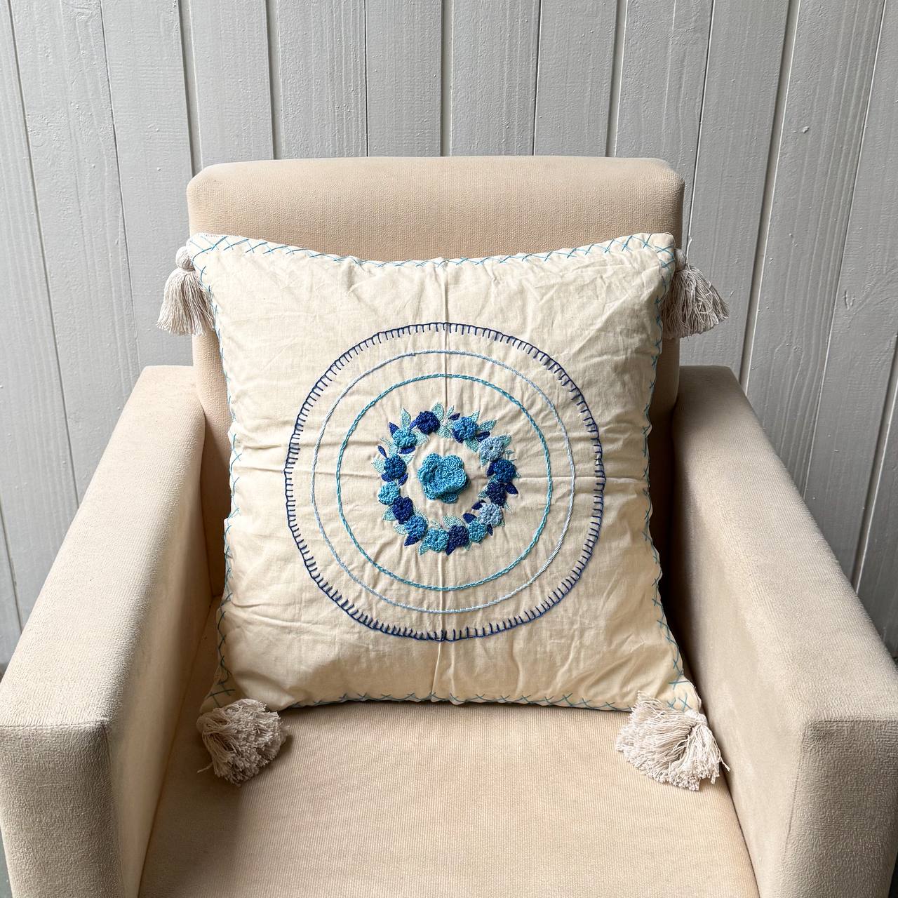 Essa capa de almofada traz um charme artesanal com um design delicado e elegante. Feita em tecido de tom cru (bege claro), ela é bordada ao centro com um círculo de flores em relevo nas tonalidades de azul e turquesa, rodeadas por linhas circulares bordadas em diferentes espessuras, criando um efeito de mandala.