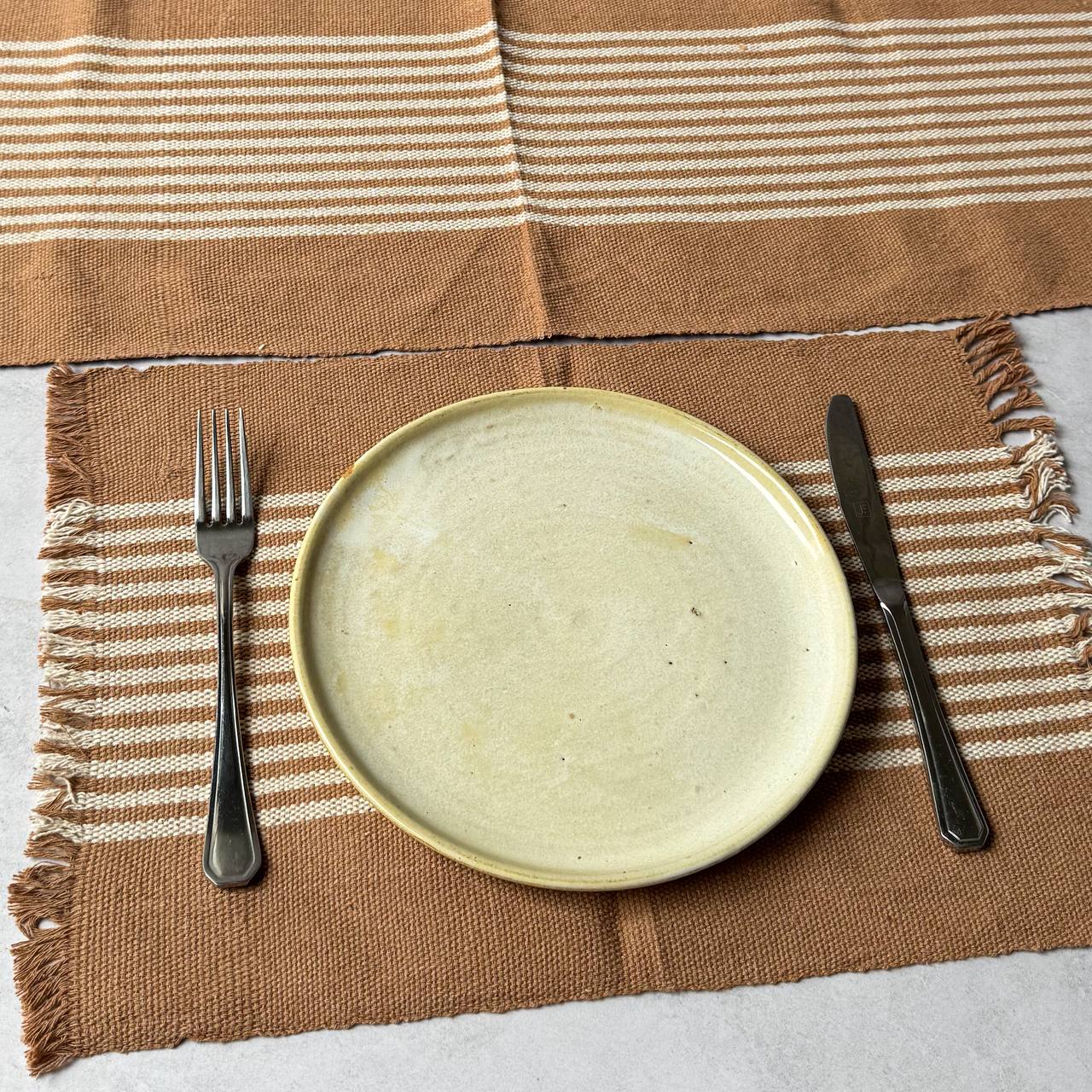 Jogo americano 7 peças - Listras Cru e Bordas Caramelo
