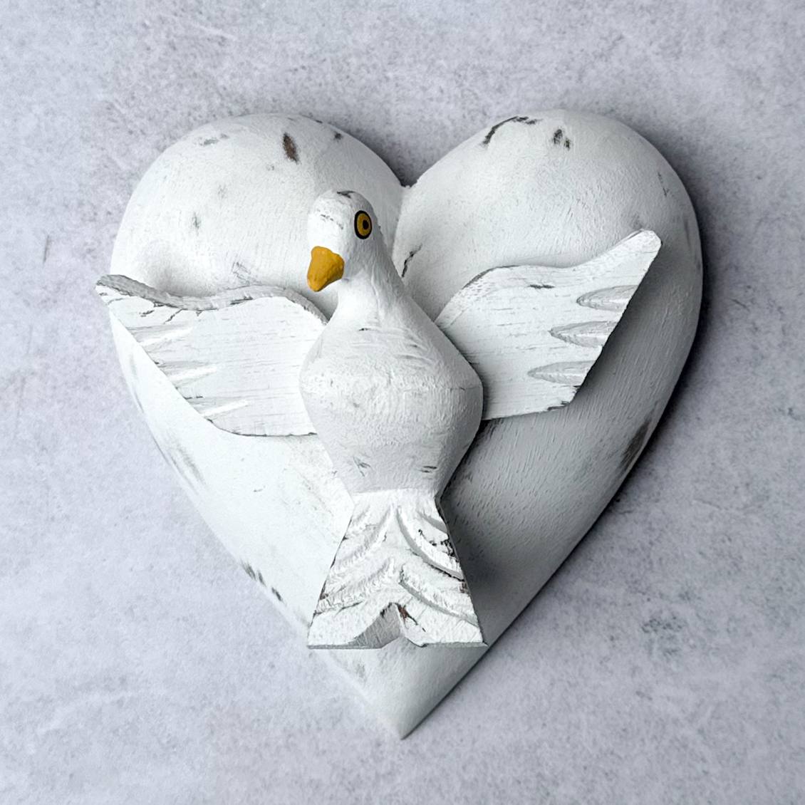 Essa peça artesanal é feita em madeira, no formato de coração, com acabamento liso e tonalidade branca. No centro, destaca-se o espírito santo entalhada em relevo, com asas abertas e detalhes marcantes no rabo, simbolizando paz e espiritualidade. O contraste entre as diferentes nuances da madeira valoriza ainda mais o trabalho manual.
