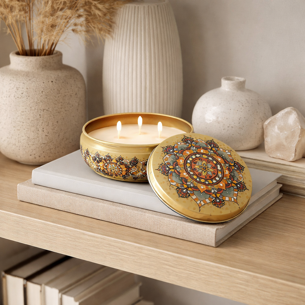 Vela Aromática Lata 120g – Longa Duração (23h a 25h) com 03 pavios de algodão.