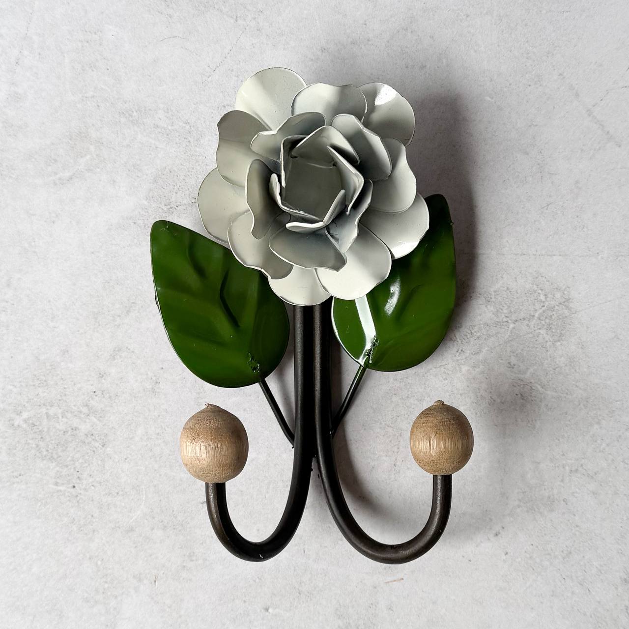 O gancho apresenta um formato de flor, com detalhes intrincados que trazem um charme rústico e ao mesmo tempo sofisticado. Ponteiras com acabamento em madeira.