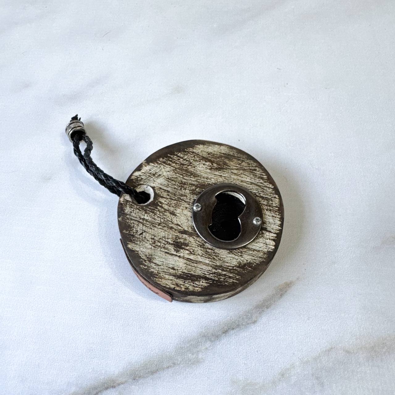 Abridor de garrafa fixado em madeira, unindo funcionalidade e estética artesanal. Com superfície lixada e acabamento suave ao toque.