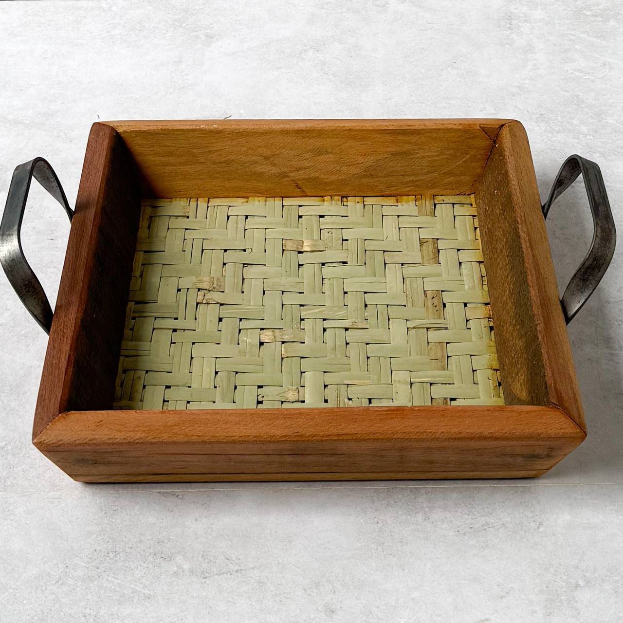 Bandeja retangular em madeira com alças laterais em ferro e fundo trançado em palha natural. A combinação dos materiais traz um charme rústico e artesanal, valorizando o trabalho manual e a autenticidade da peça.