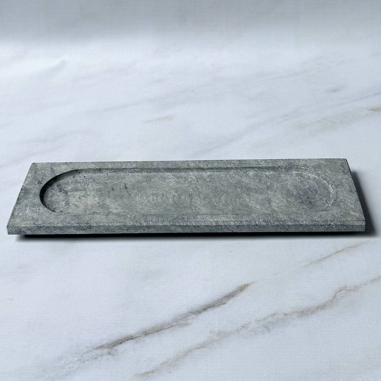 Bandeja esculpida em pedra-sabão natural, com tonalidade cinza suave e variações únicas de veios, que revelam a beleza orgânica da matéria-prima. Possui acabamento trazendo elegância rústica e atemporal à peça.