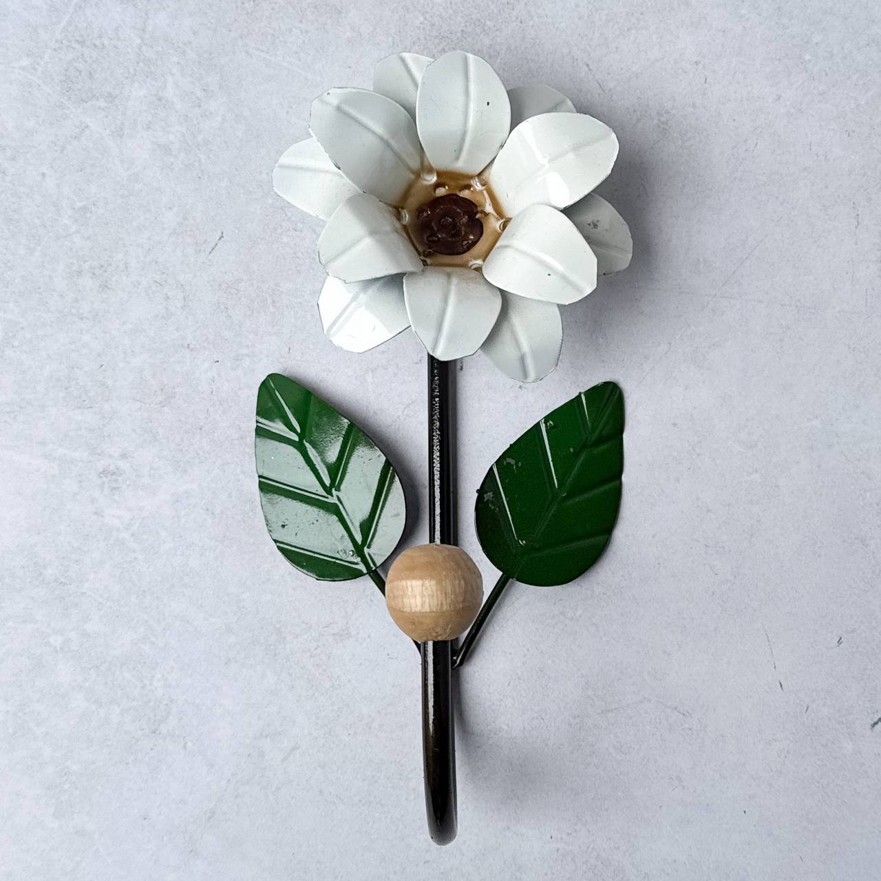 O gancho apresenta um formato de flor, com detalhes intrincados que trazem um charme rústico e ao mesmo tempo sofisticado. Ponteira com acabamento em madeira.
