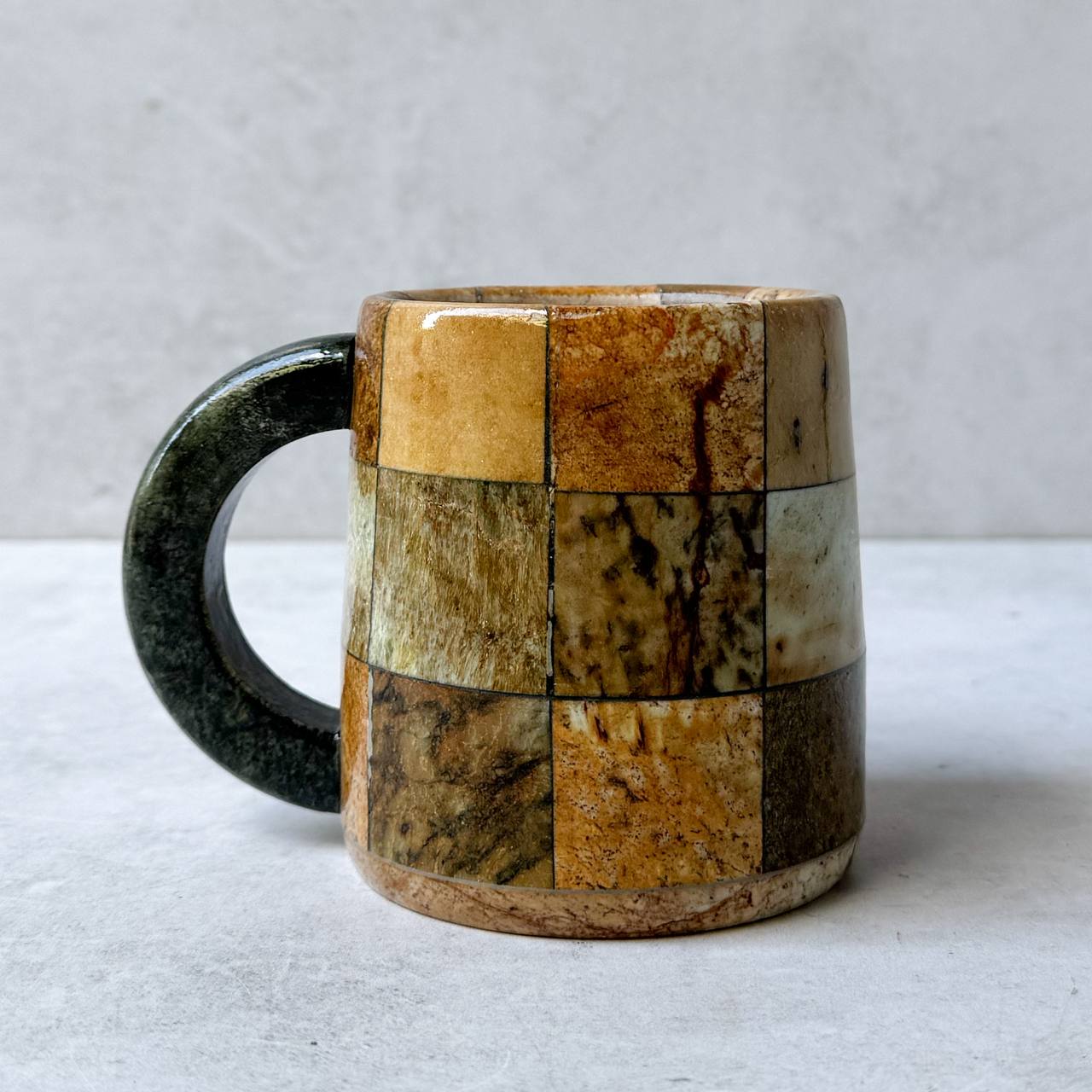 Esta é uma caneca artesanal de pedra-sabão, trabalhada em um belo mosaico de cores naturais da própria pedra. Os blocos em tons que variam entre bege, marrom, verde e cinza criam um visual único e sofisticado, ressaltando a beleza autêntica do material.