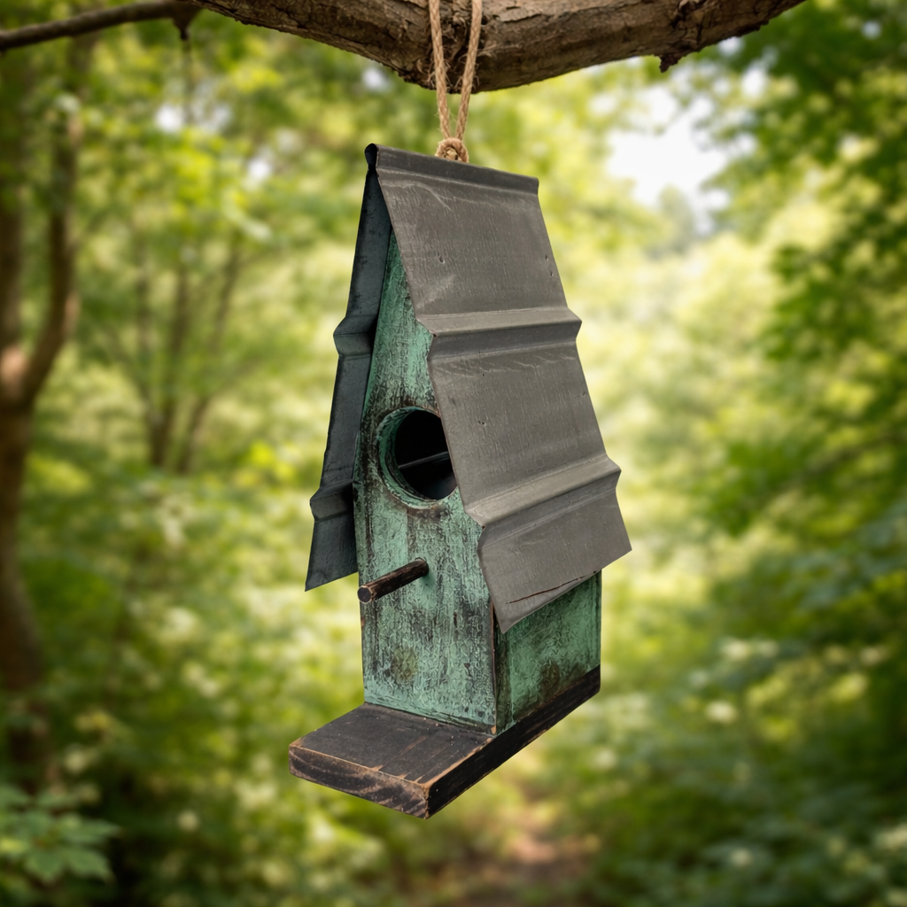 Casinha de passarinho com design rústico e acabamento envelhecido. Possui telhado com recortes marcados em chapa de zinco e efeito levemente ondulado, trazendo charme artesanal à composição. A abertura circular frontal e o pequeno apoio em formato de haste reforçam a proposta clássica de casinha para aves.