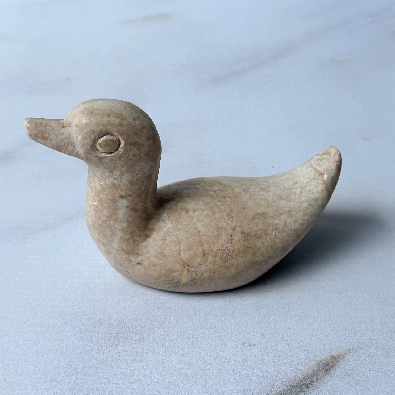 Escultura decorativa de pato em pedra-sabão natural, esculpida artesanalmente com atenção aos detalhes e às formas suaves do animal. A peça apresenta acabamento liso e fosco, com nuances e veios naturais da pedra, garantindo exclusividade a cada exemplar.
