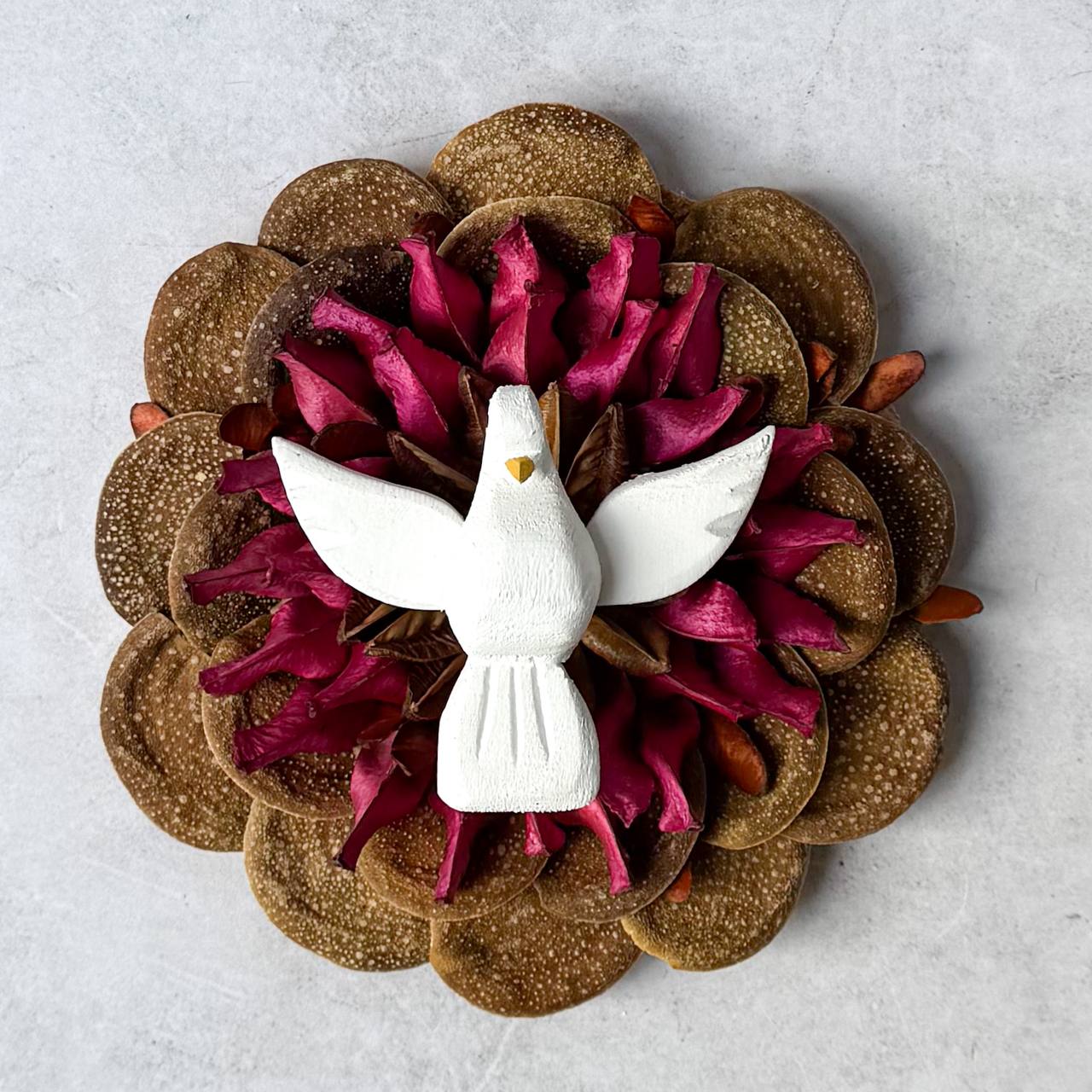 O fundo é cuidadosamente montado com sementes de canoinha, formando uma base circular em tom marrom terroso, que transmite rusticidade e conexão com a natureza. Entre elas, pétalas secas em tonalidade vermelho-vinho criam contraste vibrante e dão profundidade à peça, ressaltando ainda mais a figura central da pomba.