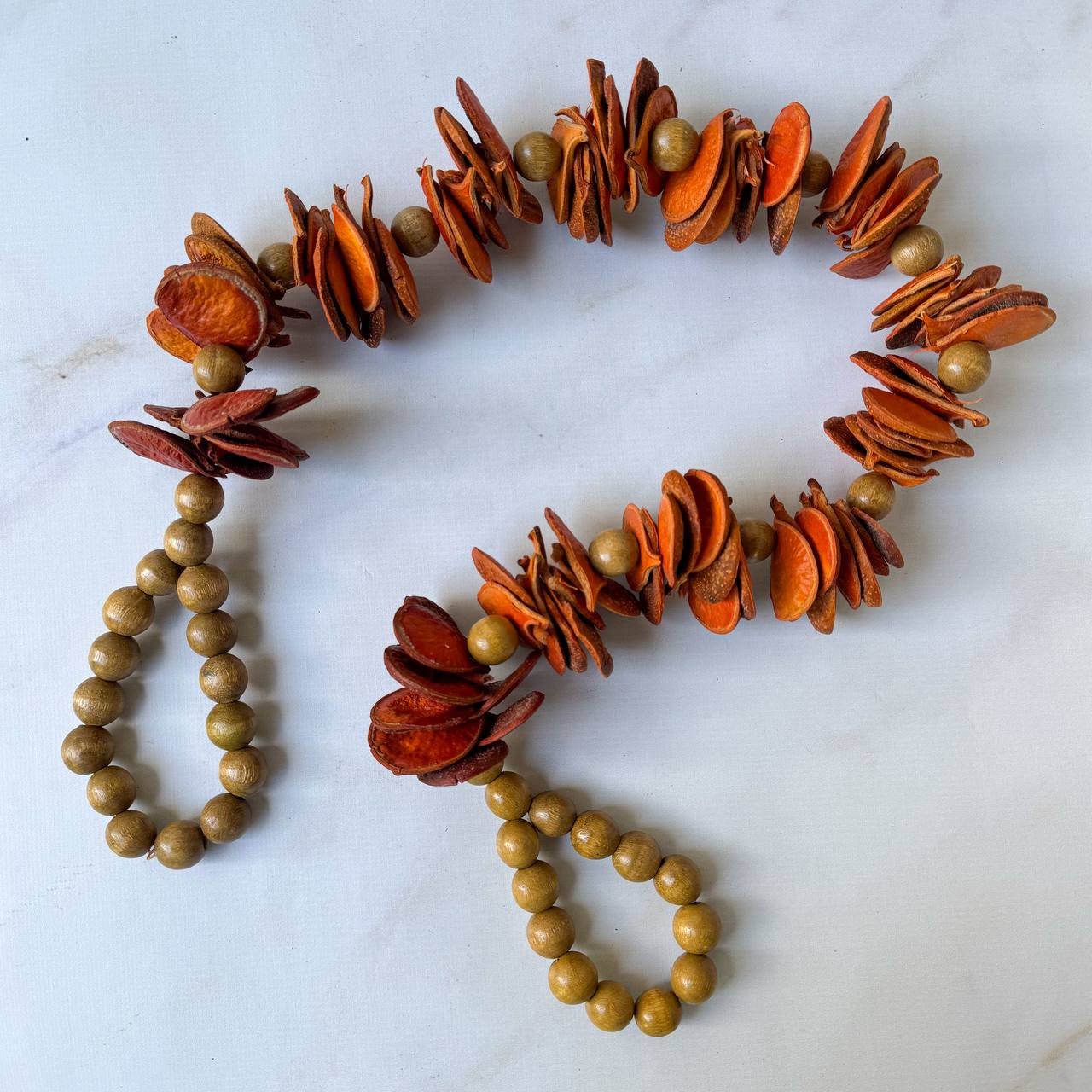 Este colar de mesa é uma peça decorativa artesanal com estética rústica e natural. Ele combina contas arredondadas de madeira clara com grandes elementos orgânicos feitos de pétalas secas — cascas ou sementes naturais — que formam volumes florais irregulares e cheios de textura.