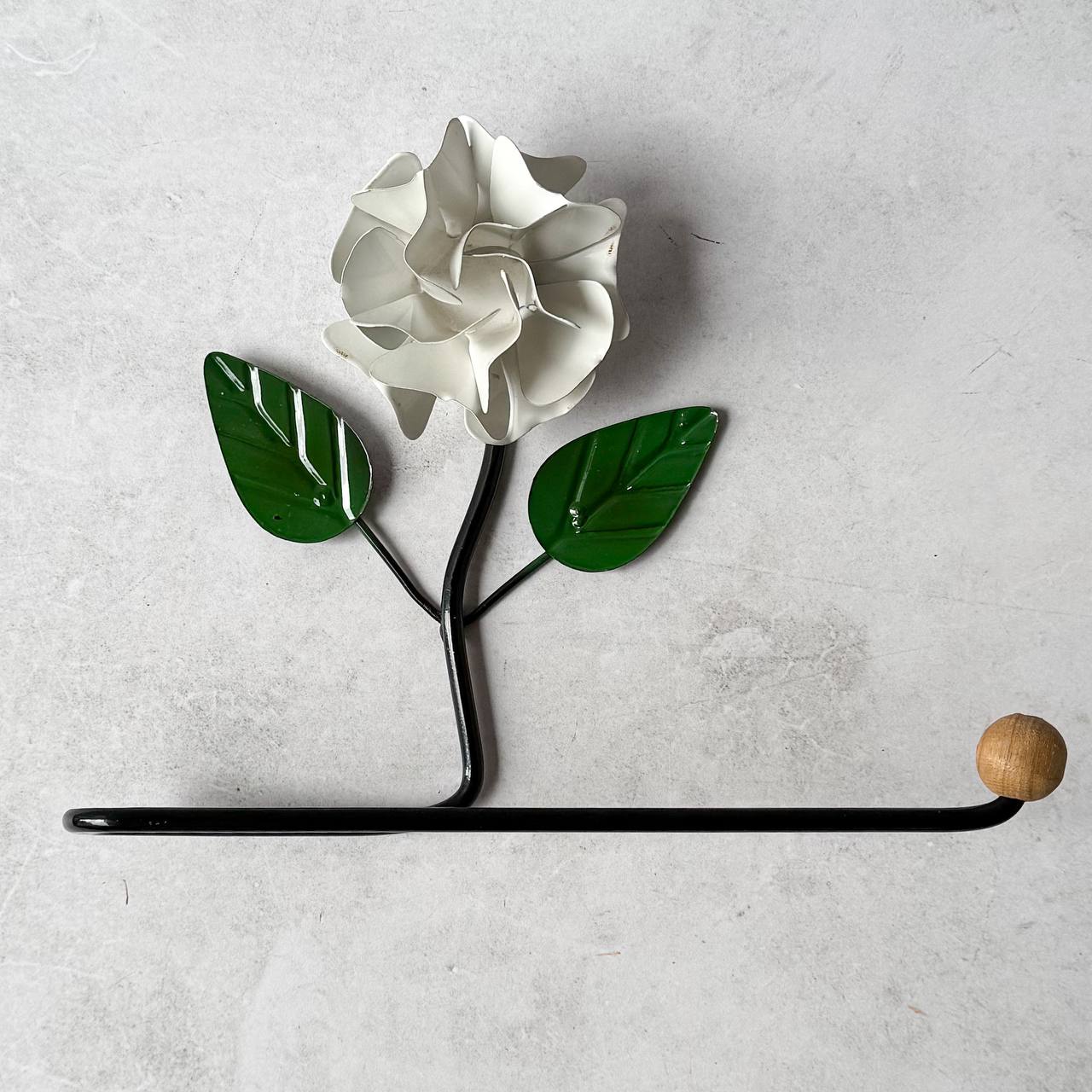Leve charme e personalidade para a sua cozinha com este lindo porta papel toalha/pano de copa em ferro. Com design artesanal, ele conta com uma delicada flor branca e folhas verdes esmaltadas, criando um visual encantador que combina com cozinhas de estilo rústico, retrô ou romântico.
