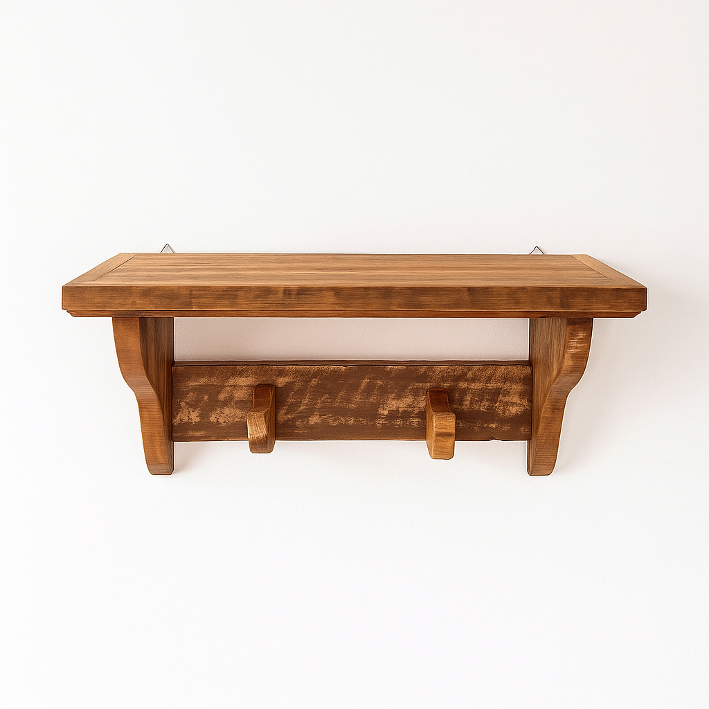 Esse é um suporte de madeira rústico composto por uma pequena prateleira na parte superior e dois ganchos na parte inferior. A estrutura é feita em madeira maciça, com acabamento natural que valoriza os veios e tons amadeirados. As laterais possuem cortes curvos que dão um charme artesanal à peça, enquanto os ganchos reforçam a funcionalidade, permitindo pendurar utensílios, chaves, canecas ou acessórios. O design simples e robusto combina bem com ambientes de estilo rústico, farmhouse ou campestre, trazendo praticidade e aconchego à decoração.