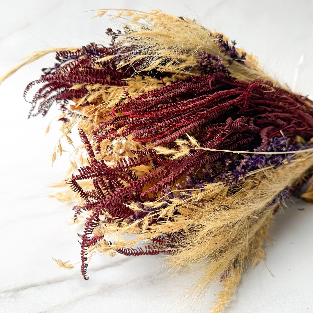 Bouquet de flores desidratadas com aproximadamente 60 cm de altura, cuidadosamente composto por hastes naturais selecionadas. A combinação harmoniosa de tons terrosos, bege, palha e nuances de marsala criam um visual acolhedor, rústico e sofisticado ao mesmo tempo.