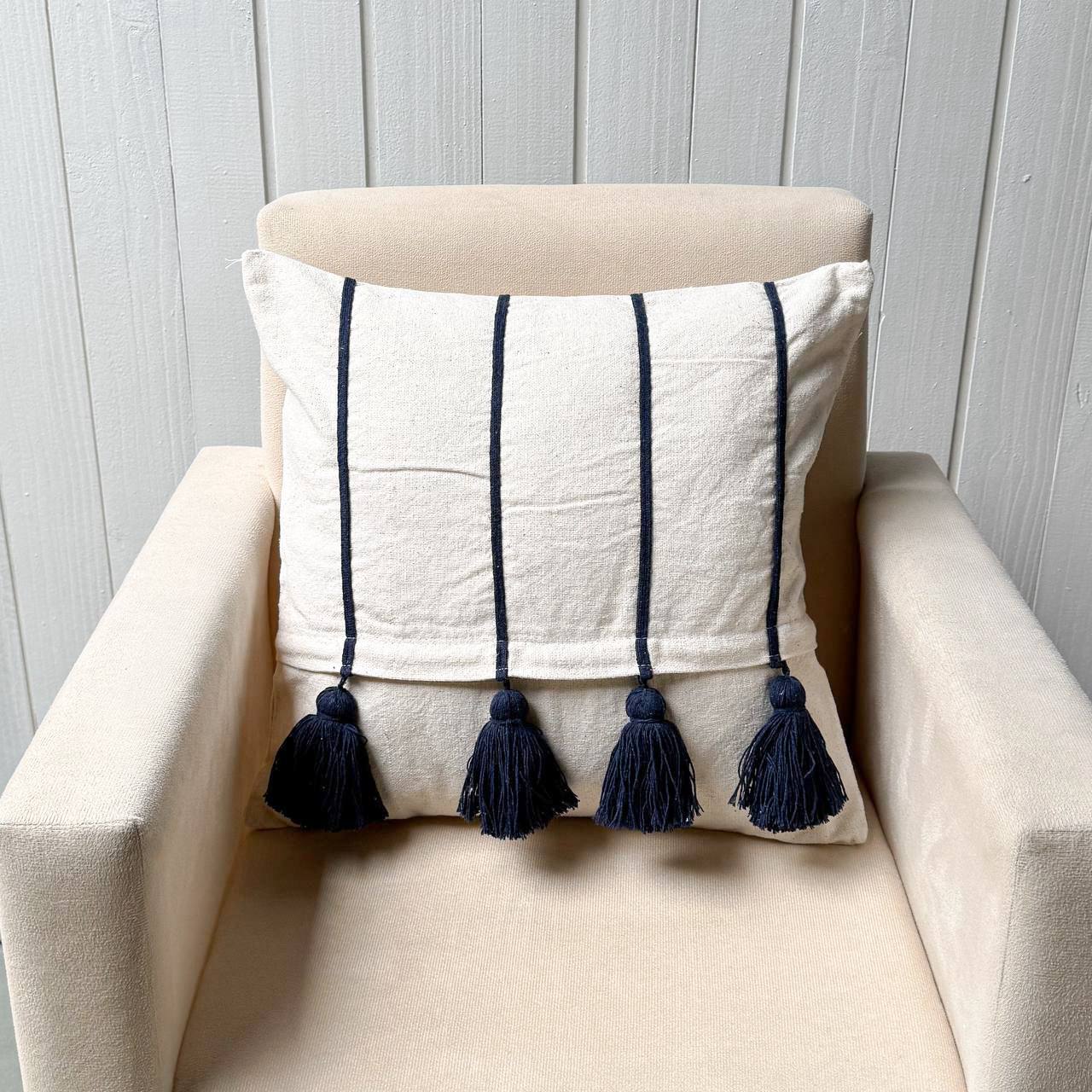 Aposte na elegância do simples com essa capa de almofada rústica, confeccionada em algodão de alta qualidade. O detalhe em azul e pompons traz textura, autenticidade e o charme do trabalho artesanal, deixando a peça única e cheia de personalidade.