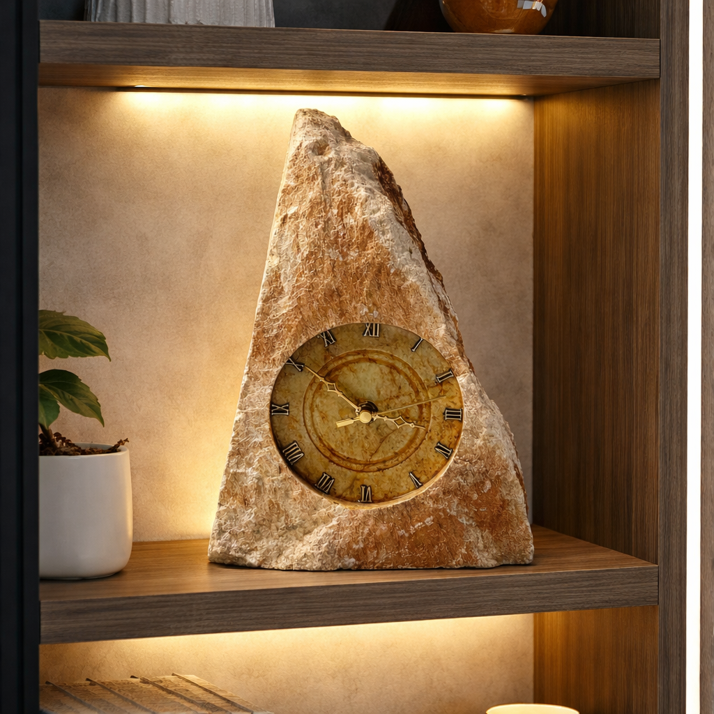 O mostrador circular é embutido na pedra e possui acabamento envelhecido e envernizado, com algarismos romanos em relevo que conferem um charme clássico e atemporal. Os ponteiros metálicos contrastam delicadamente com a superfície mineral, garantindo boa leitura e elegância.