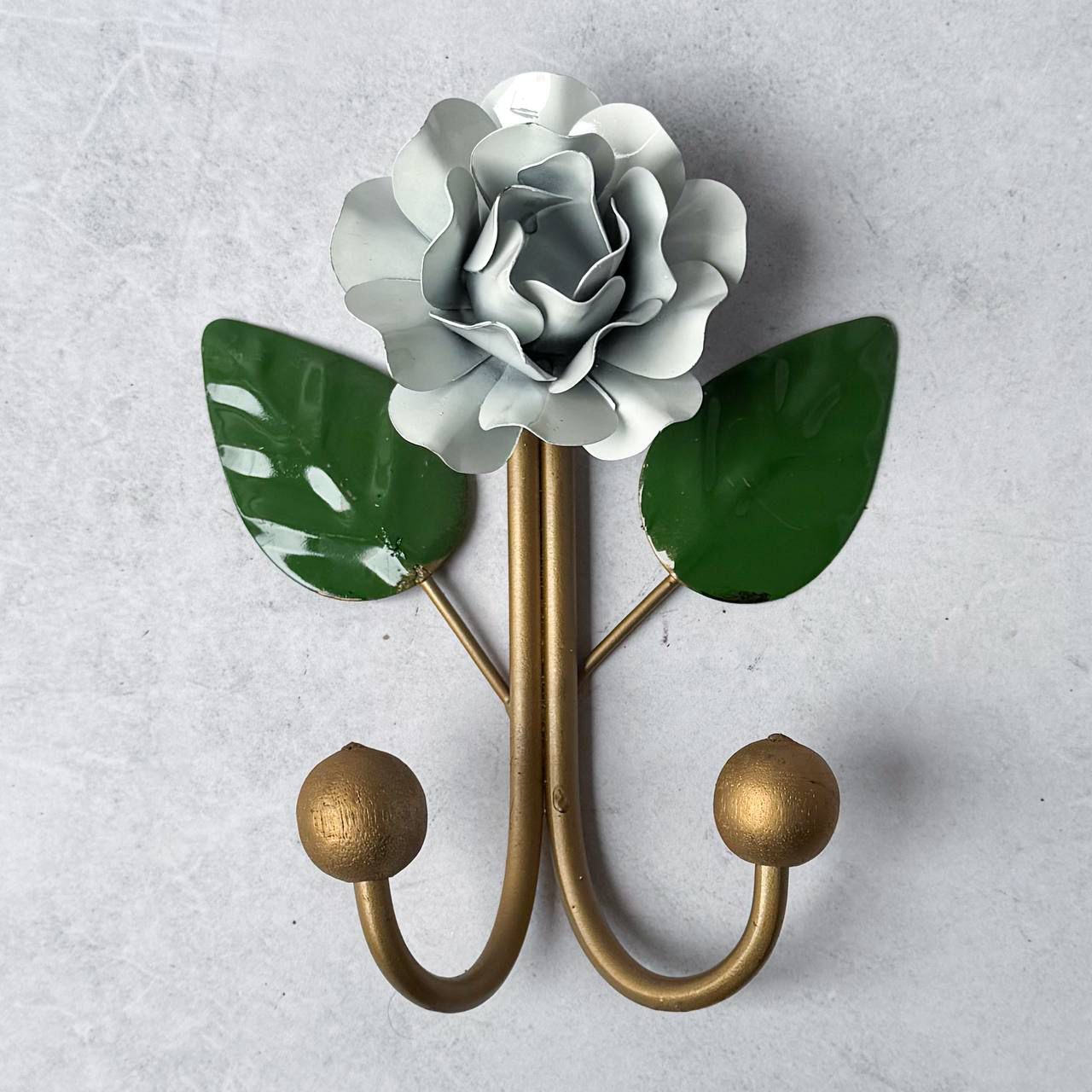 O gancho apresenta um formato de flor, com detalhes intrincados que trazem um charme rústico e ao mesmo tempo sofisticado. Ponteiras com acabamento em madeira.