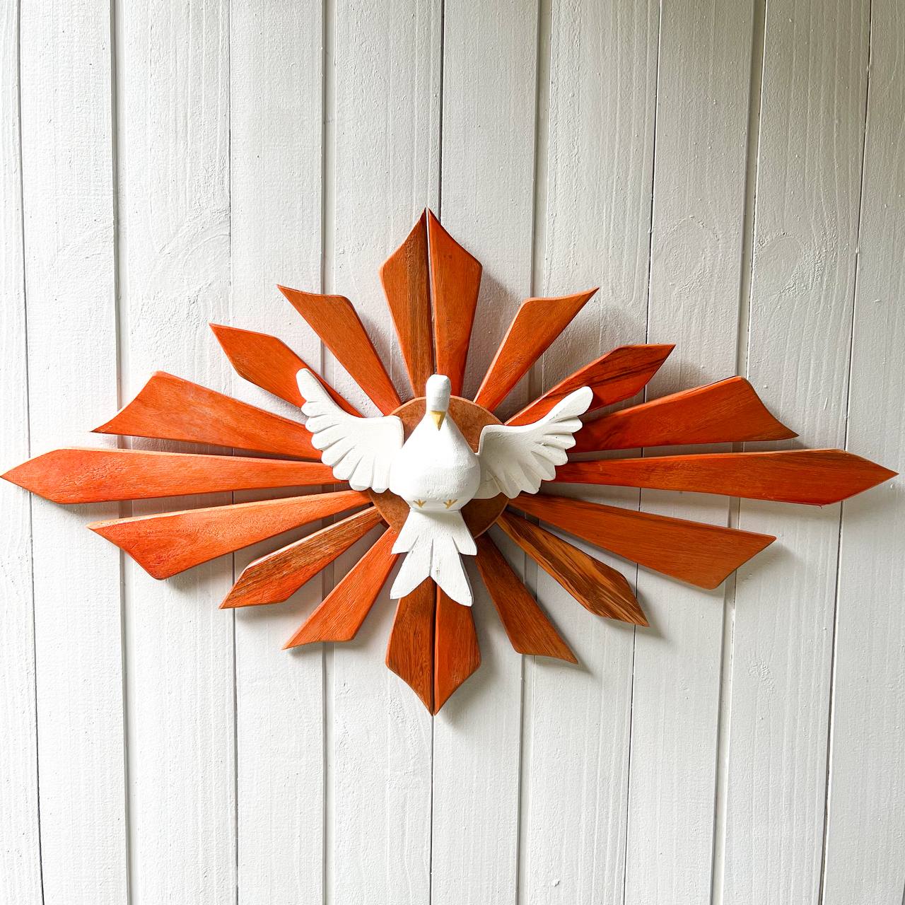 No centro, há uma pomba branca esculpida, com asas abertas, simbolizando o Espírito Santo. Ao redor dela, partem raios em madeira natural pintada em tom alaranjado, que lembram a luz divina irradiando. O fundo claro ajuda a destacar os detalhes da peça, valorizando o contraste entre o branco da pomba e o calor da madeira.