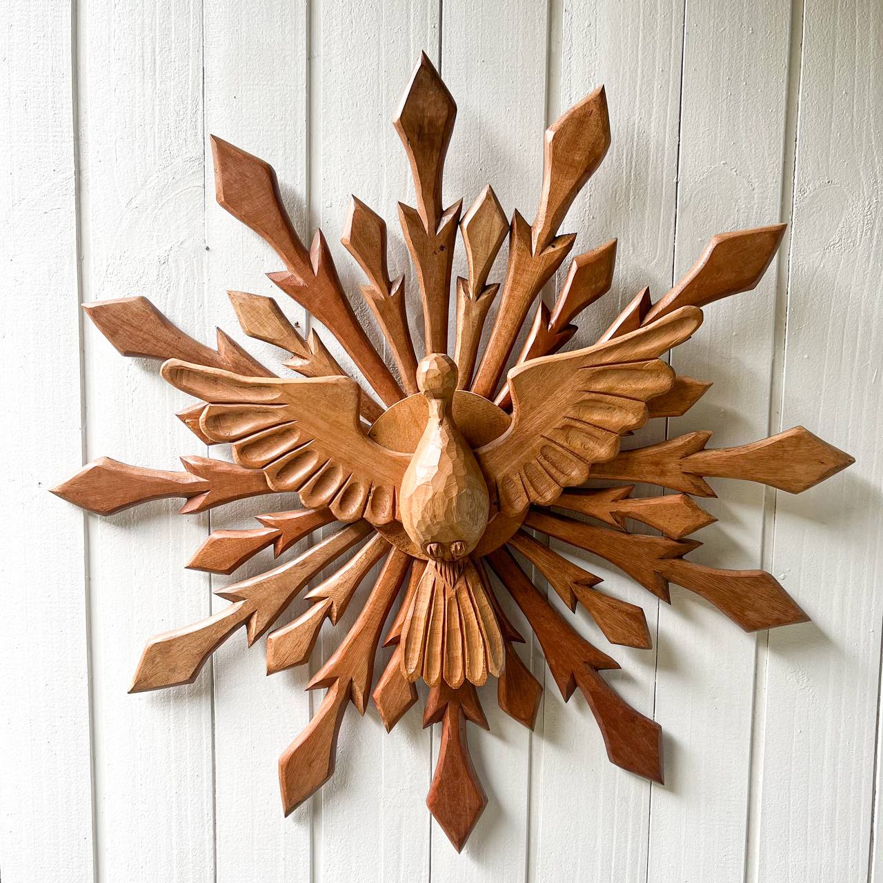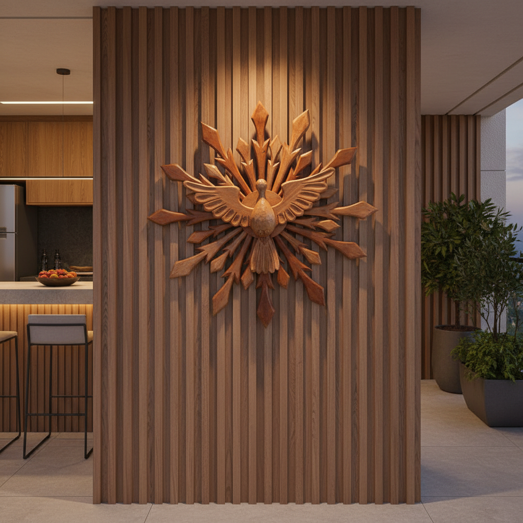 No centro, a pomba com asas abertas e cauda detalhada representa o Espírito Santo, trazendo um ar de movimento e imponência. Ao redor, diversos raios em diferentes formatos e tamanhos criam um efeito marcante de luz e energia, todos em tom amadeirado, que valoriza a rusticidade e a sofisticação da peça.