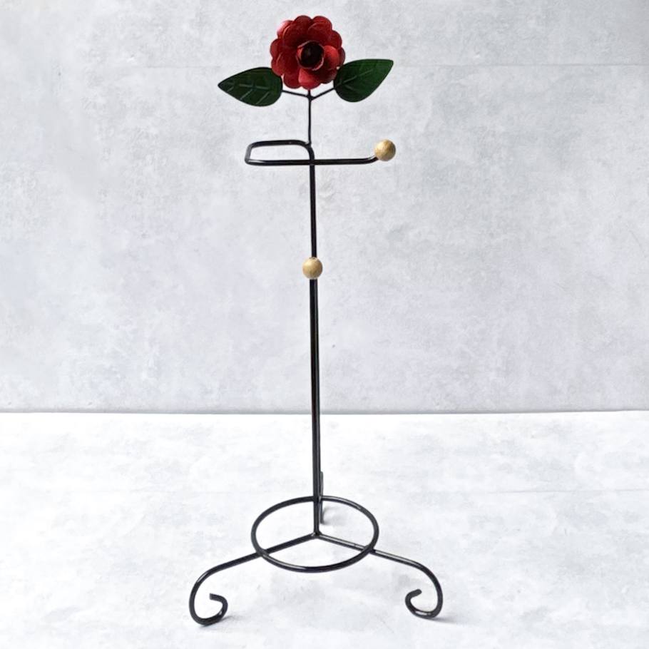 Design: Flor vermelha com folhas verdes e ponteiras de madeira
