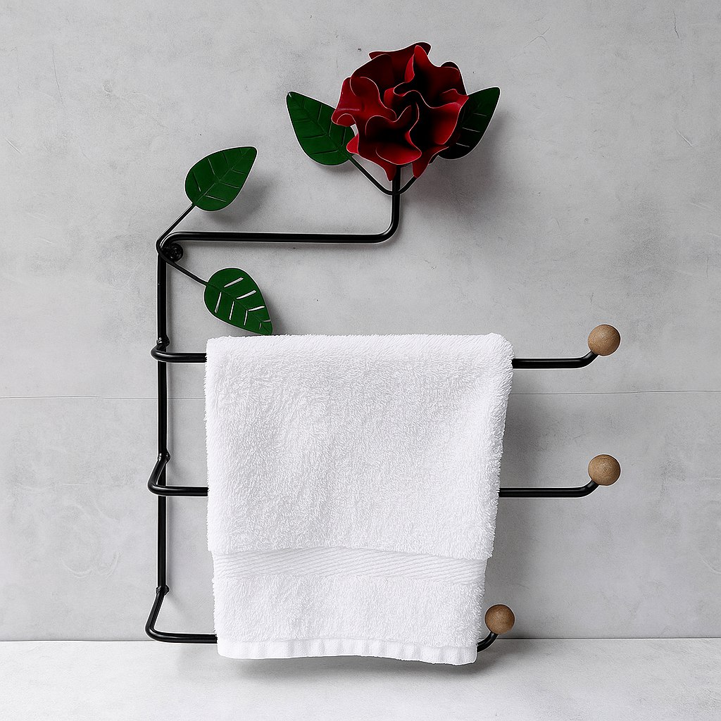 Adicione charme e praticidade ao seu banheiro ou cozinha com este elegante porta-toalhas de parede em ferro. Com um design exclusivo em formato de galho, ele traz uma delicada flor vermelha metálica no topo e folhas verdes que remetem à natureza, transformando um item funcional em peça decorativa.
