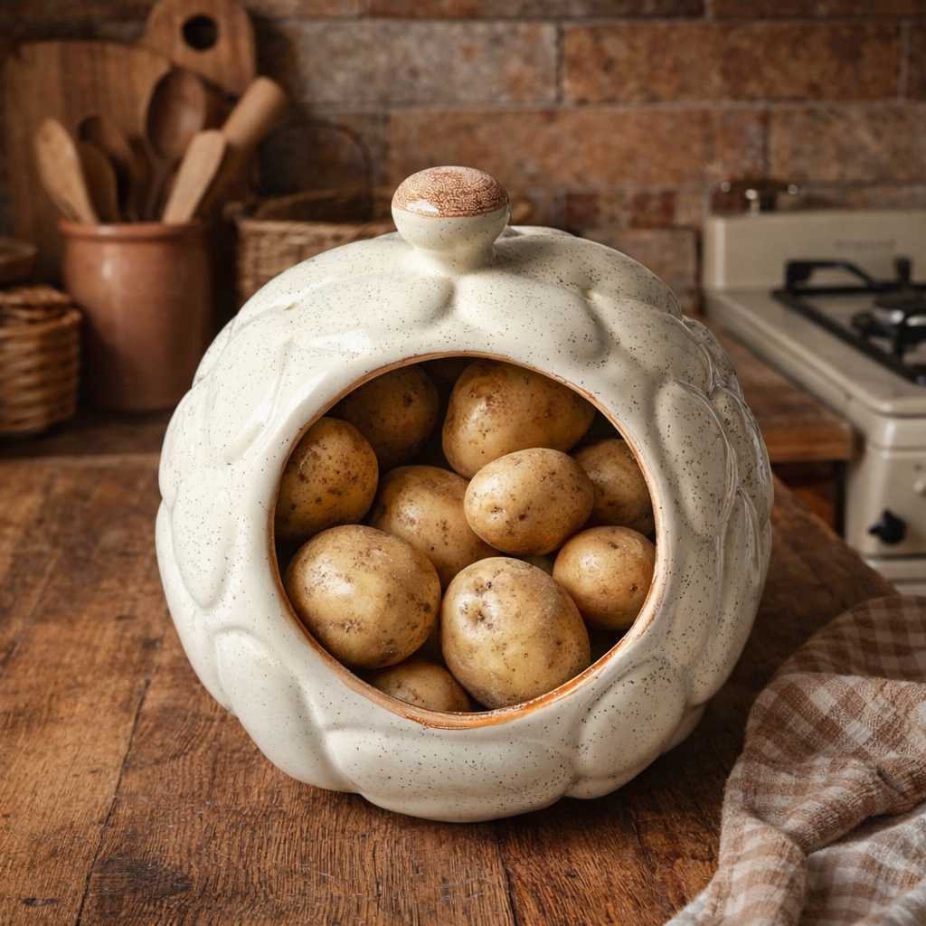 Este charmoso porta-batatas em cerâmica une funcionalidade e decoração de forma impecável. Com design inspirado em uma abóbora, a peça possui acabamento artesanal em tom off-white com delicados pontilhados, trazendo um visual aconchegante e atemporal.
