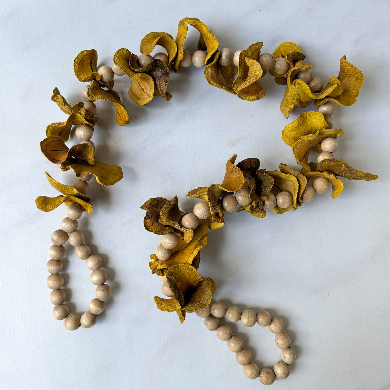 Este colar de mesa é uma peça decorativa artesanal com estética rústica e natural. Ele combina contas arredondadas de madeira clara com grandes elementos orgânicos feitos de pétalas secas — cascas ou sementes naturais — que formam volumes florais irregulares e cheios de textura.