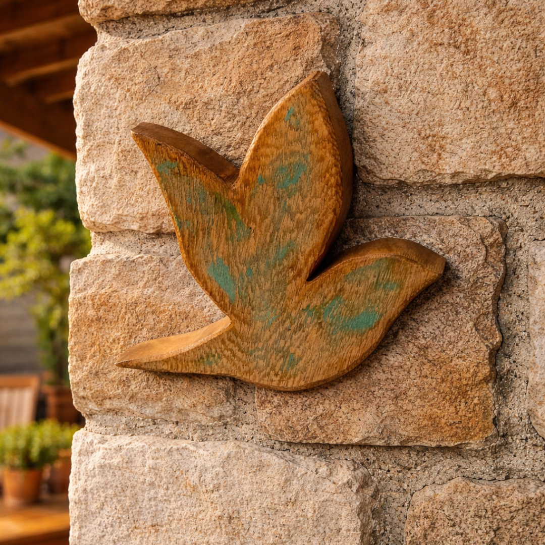 O pássaro de madeira se destaca sobre a parede, criando um contraste acolhedor entre a madeira e a pedra.