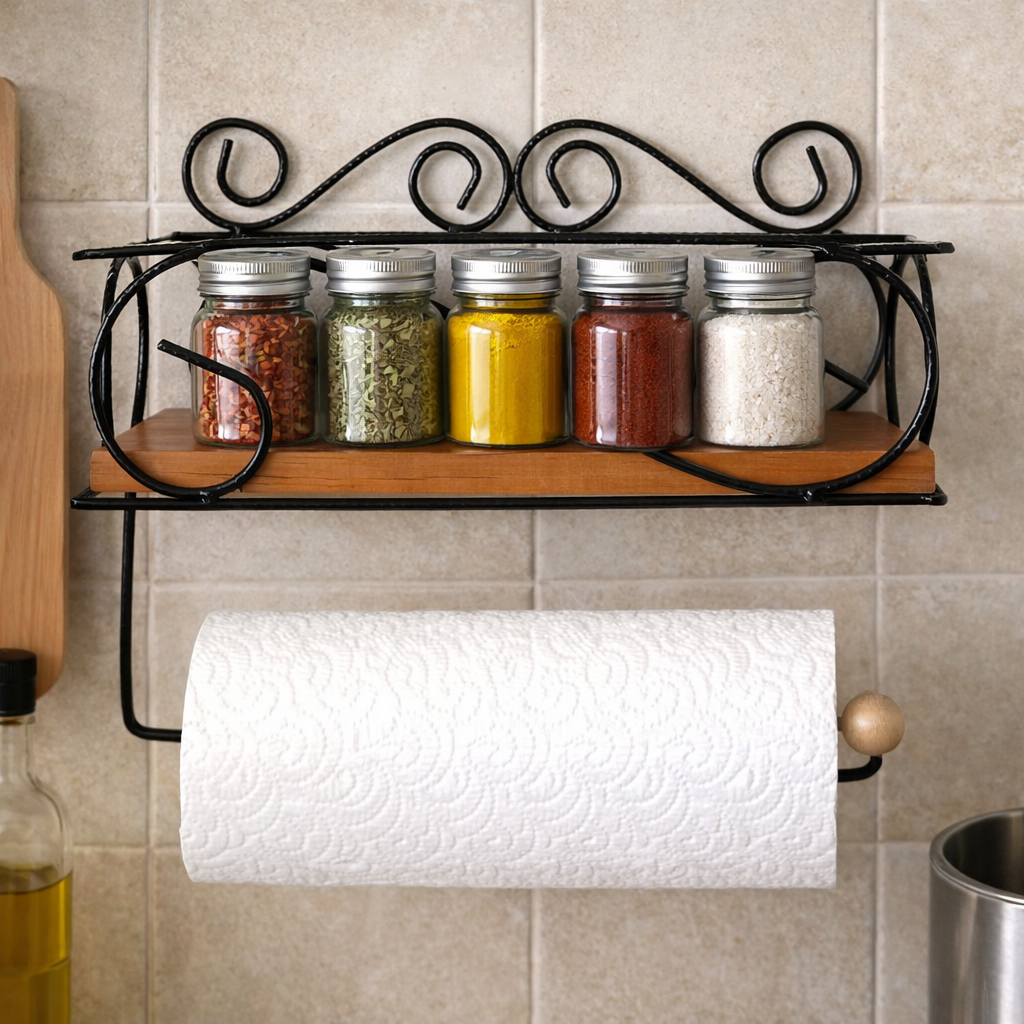 Na parte inferior, a peça conta com um suporte integrado para rolo de papel-toalha, também em ferro, com uma bolinha de madeira na extremidade, que facilita o manuseio e acrescenta um detalhe rústico e delicado.