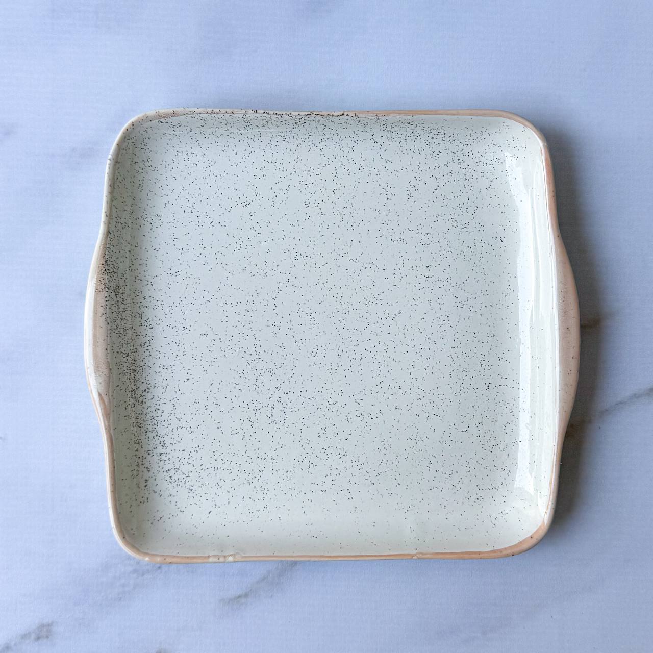 Prato quadrado de cerâmica, com bordas bem definidas e levemente elevadas, que emolduram a peça com elegância. O design clean valoriza as linhas retas do formato quadrado, trazendo um visual moderno e ao mesmo tempo atemporal. A cerâmica confere robustez e durabilidade, enquanto o acabamento suave destaca a qualidade artesanal. Ideal para servir refeições, entradas ou sobremesas, é uma peça versátil que se adapta tanto a mesas contemporâneas quanto a composições mais clássicas.