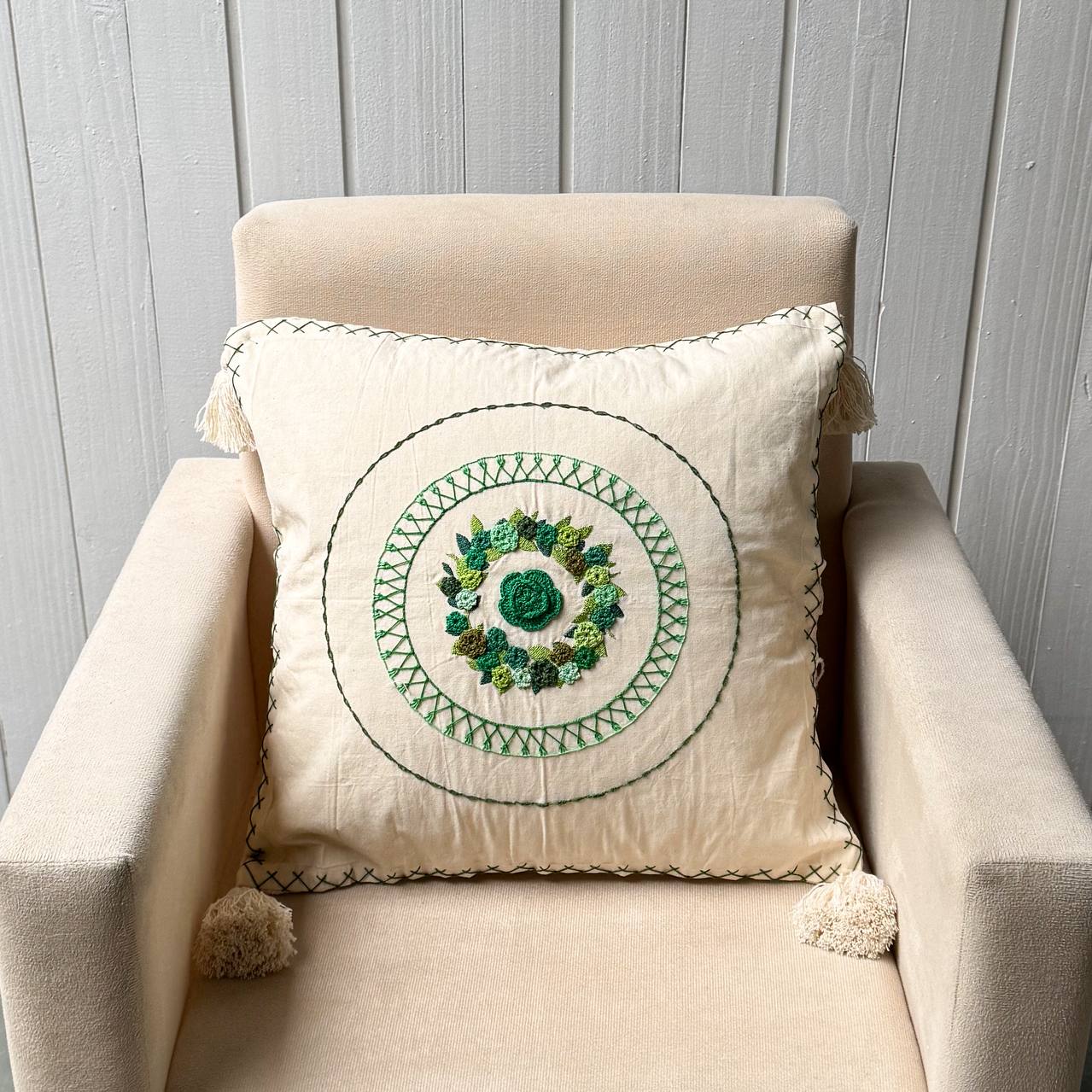 Essa capa de almofada é feita em tecido cru (bege claro) e se destaca pelo bordado central em formato circular, que lembra uma mandala floral. No centro, há flores em relevo bordadas em diferentes tons de verde, rodeadas por círculos concêntricos bordados que trazem movimento e harmonia ao desenho.