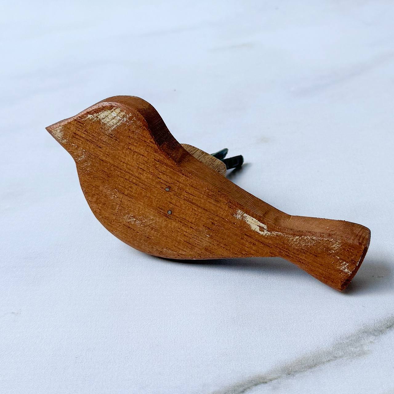 O gancho de madeira tem formato delicado de pássaro, esculpido artesanalmente com linhas suaves e orgânicas. A peça apresenta um acabamento em madeira de tom quente, com efeito envelhecido, marcado por pinceladas irregulares de tinta branca, que trazem charme rústico e um visual artesanal único — cada detalhe parece propositalmente imperfeito, valorizando o trabalho manual.