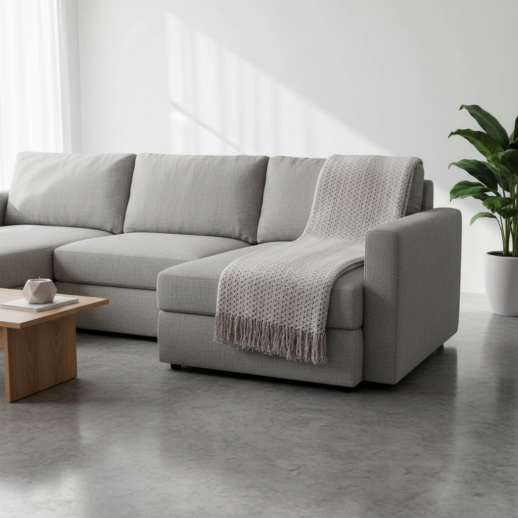 Em tom bege suave mesclado com fios claros, a manta cria um contraste bonito e acolhedor, harmonizando facilmente com poltronas, sofás ou camas. O acabamento com franjas artesanais nas extremidades reforça seu estilo natural e feito à mão, agregando personalidade à decoração.