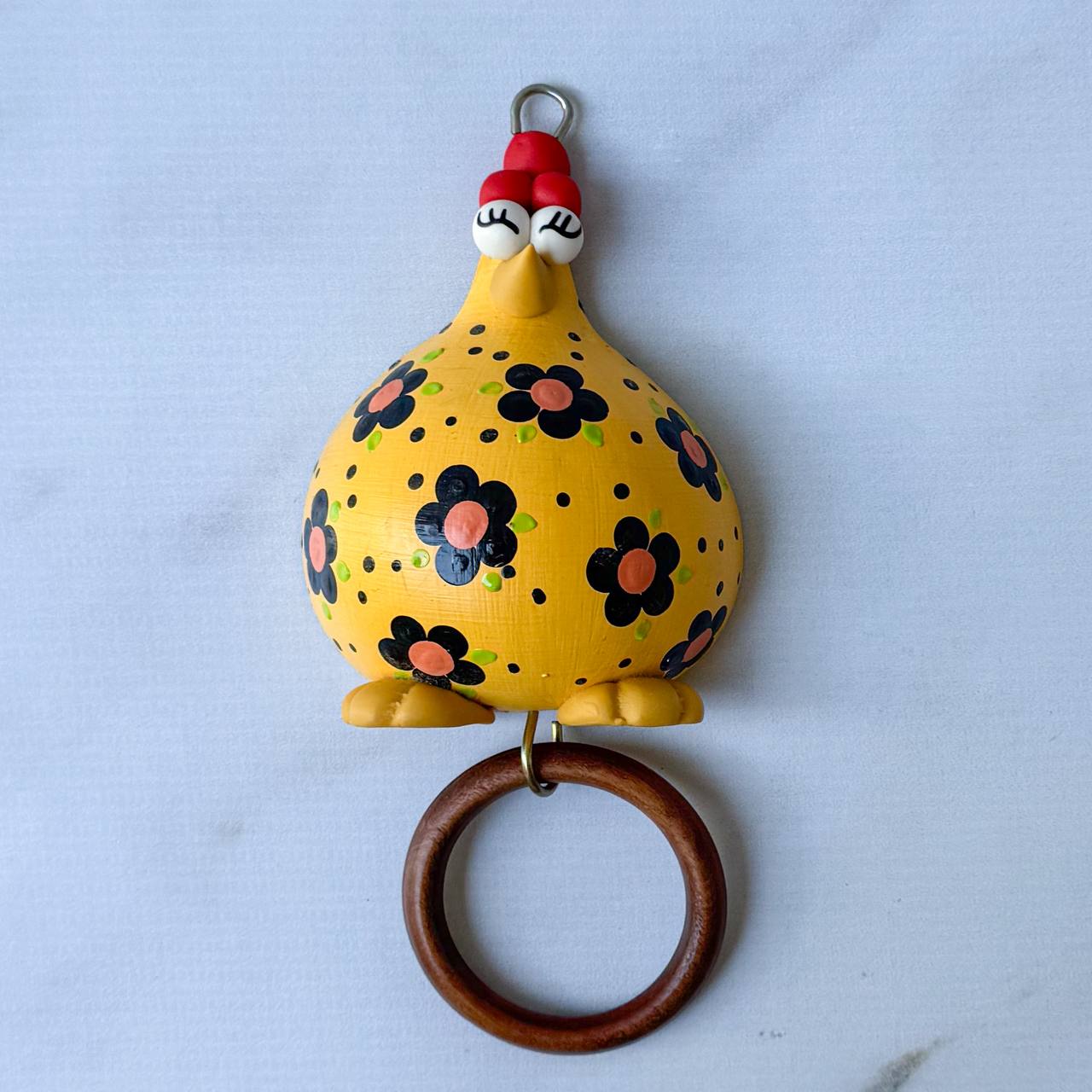 Gancho decorativo em formato de galinha de cabaça, produzido no porongo de forma artesanal, com acabamento rústico e cheio de charme. A peça apresenta detalhes cuidadosamente trabalhados, valorizando o formato orgânico da cabaça e trazendo um toque lúdico e acolhedor ao ambiente. Possui uma argola de madeira resistente, ideal para pendurar pano de prato, toalhas ou pequenos utensílios. Perfeito para cozinhas com estilo rústico, farmhouse ou espaços gourmet, unindo funcionalidade e decoração em uma peça única.
