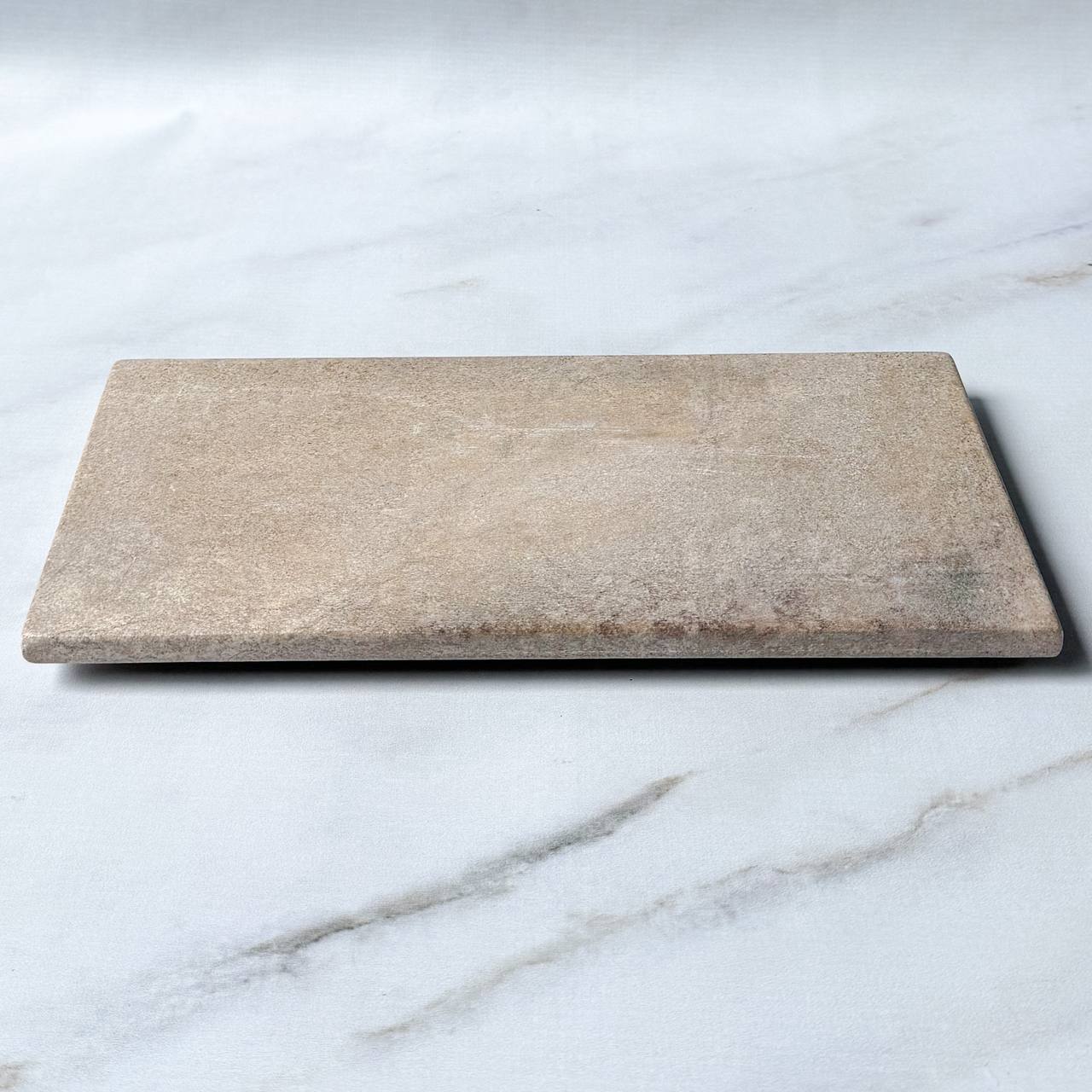 Uma base retangular de pedra sabão, trabalhada artesanalmente, com acabamento liso e cantos bem definidos. A peça destaca a beleza natural da pedra, com suas variações únicas de cor e veios, que vão do cinza a cor natural da pedra. Robusta e resistente, é versátil no uso: pode servir como suporte decorativo, base para esculturas, objetos de altar, utensílios ou até mesmo como elemento funcional na cozinha. Um item simples, porém sofisticado, que une utilidade e estética rústico-elegante.