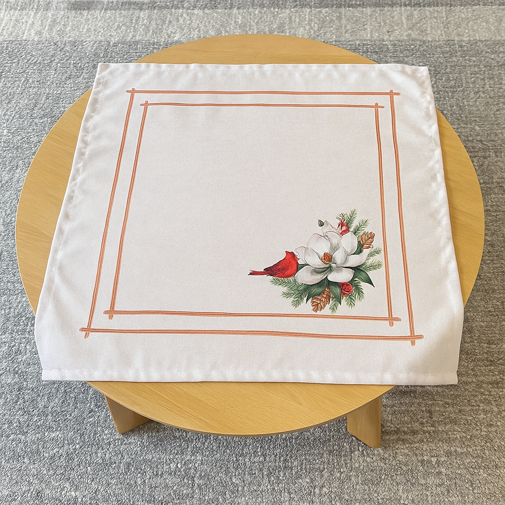 A imagem mostra uma toalhinha quadrada / guardanaopo de tecido poliéster branco, com um delicado barrado em tom avermelhado que contorna toda a peça, criando um visual elegante e natalino. No canto inferior direito, há uma estampa temática com detalhes bem trabalhados: um pequeno pássaro vermelho (cardeal), uma flor branca grande no centro (semelhante a uma magnólia), ramos de pinheiro, pinhas e pequenas frutinhas vermelhas, formando um arranjo festivo e aconchegante.