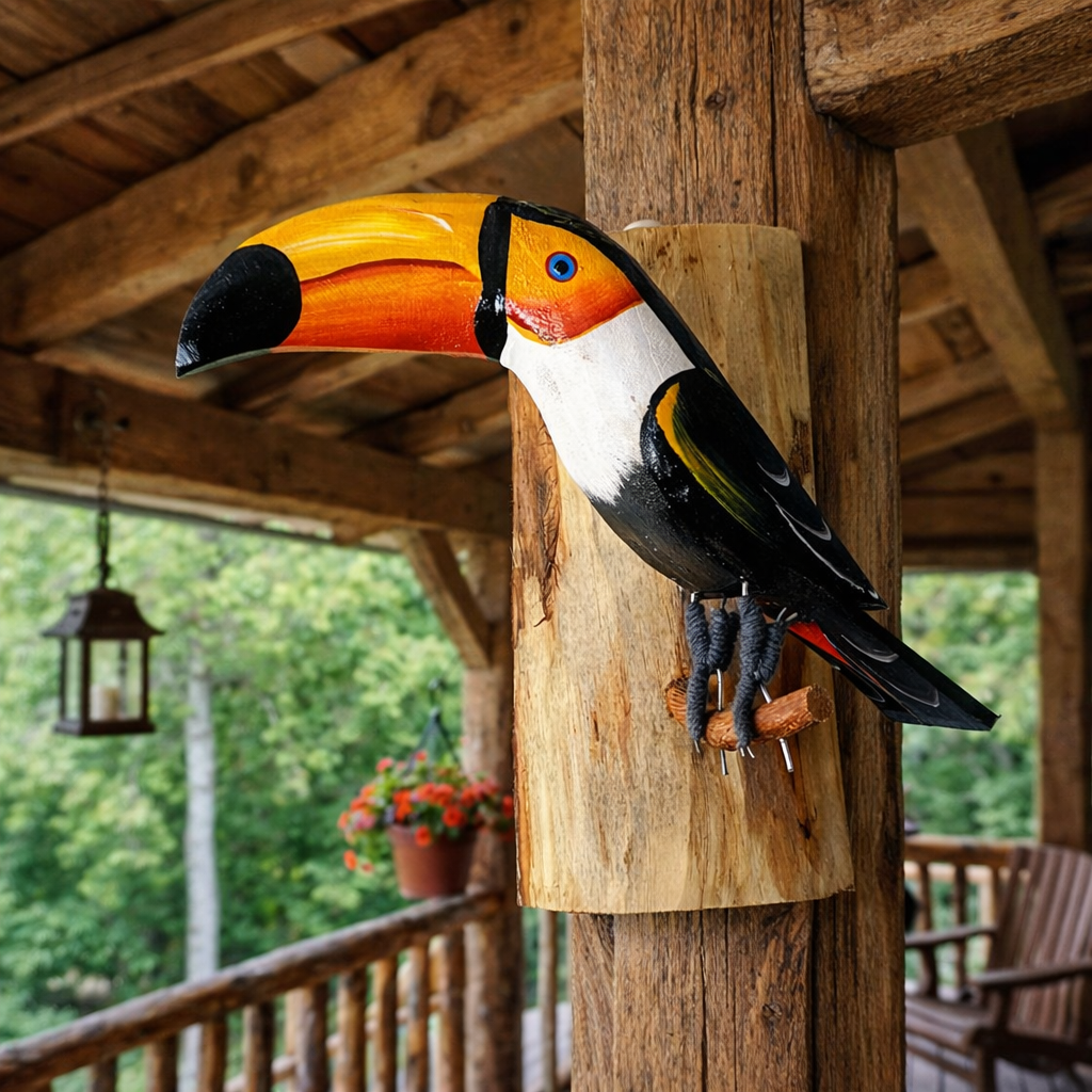 O tucano aparece pousado com delicadeza sobre um pequeno galho de madeira, esculpido de forma artesanal. Seu corpo é bem definido e pintado à mão, com cores vivas e contrastantes: o bico grande e curvo traz tons quentes de amarelo, laranja e vermelho, com a ponta preta, chamando imediatamente a atenção.