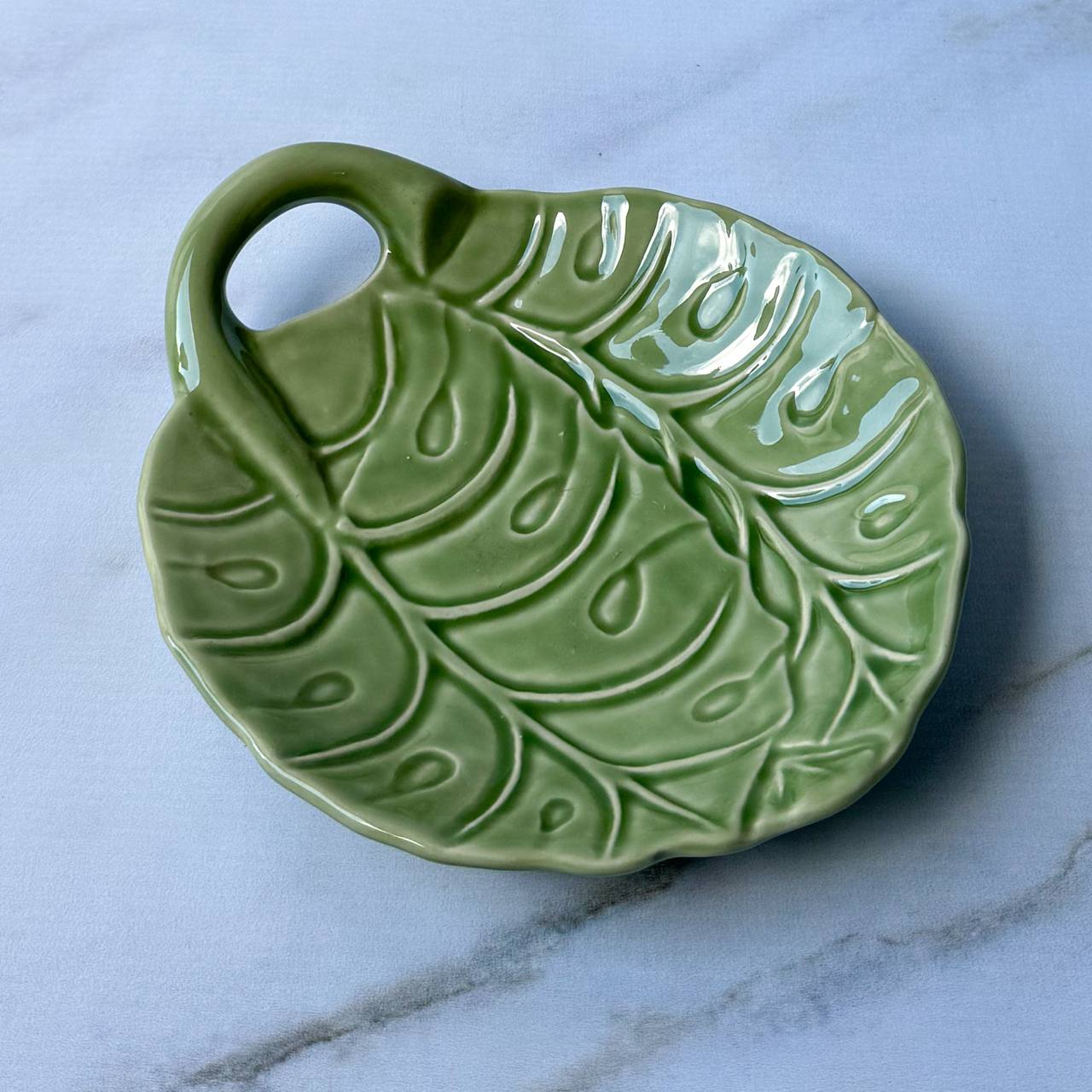 Prato em cerâmica verde em formato de folha, com design inspirado na natureza. A peça apresenta nervuras delicadas que remetem aos veios naturais da folha, trazendo movimento e um acabamento orgânico. A tonalidade verde valoriza a estética natural e confere frescor à decoração. Possui alça integrada, também em cerâmica, que além de funcional, complementa o visual artesanal da peça. Versátil e decorativo, pode ser usado para servir petiscos, frutas ou como item decorativo, agregando charme e sofisticação a mesas e ambientes.