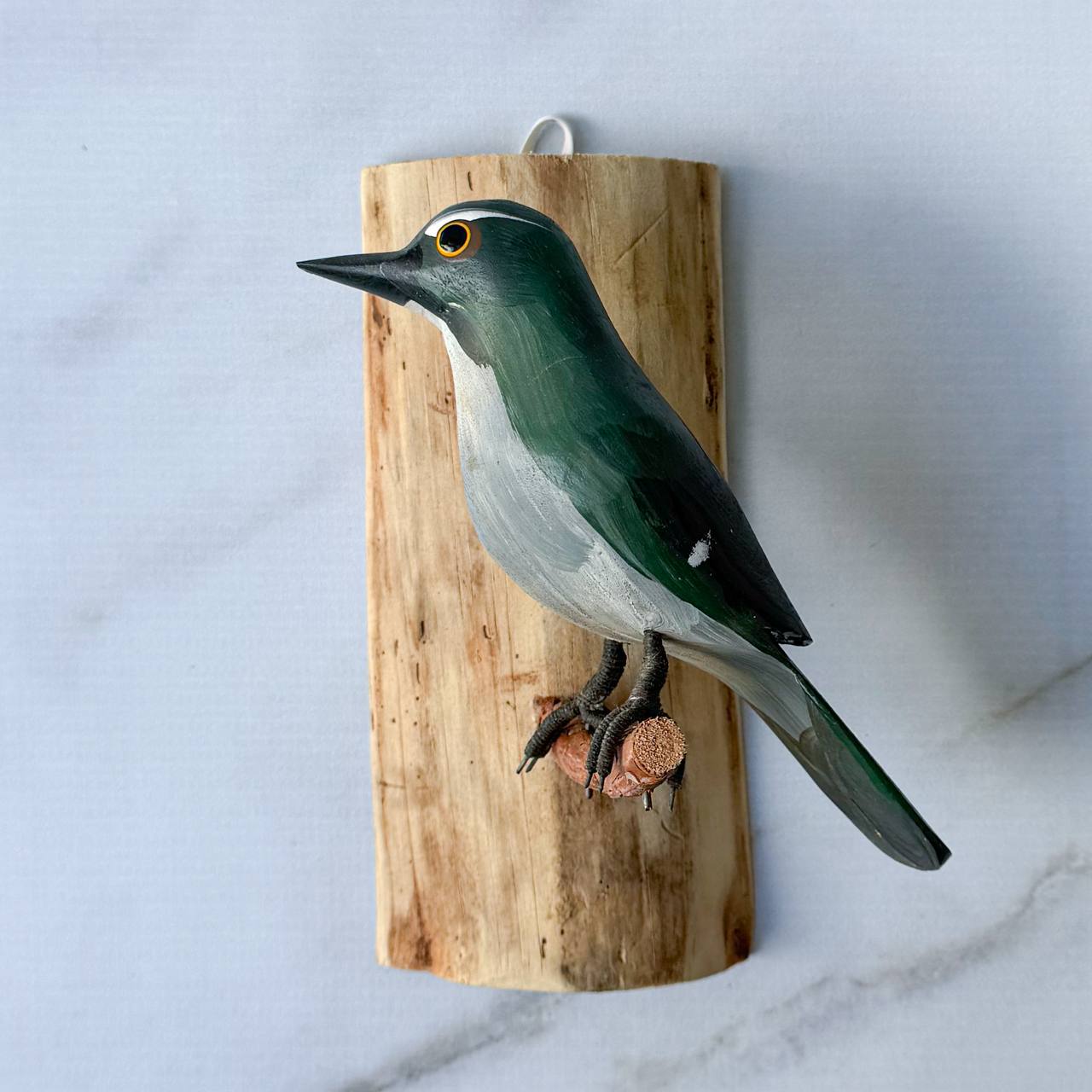 O pássaro esculpido apresenta um visual marcante e muito bem definido. Ele tem o corpo predominantemente verde, com acabamento levemente texturizado que remete às penas, transmitindo um aspecto artesanal e natural. O bico, alongado e firme, em tom verde e preto, reforçando a semelhança com aves silvestres brasileiras. O olho é destacado em amarelo com contorno escuro, o que dá expressividade e vida à peça.