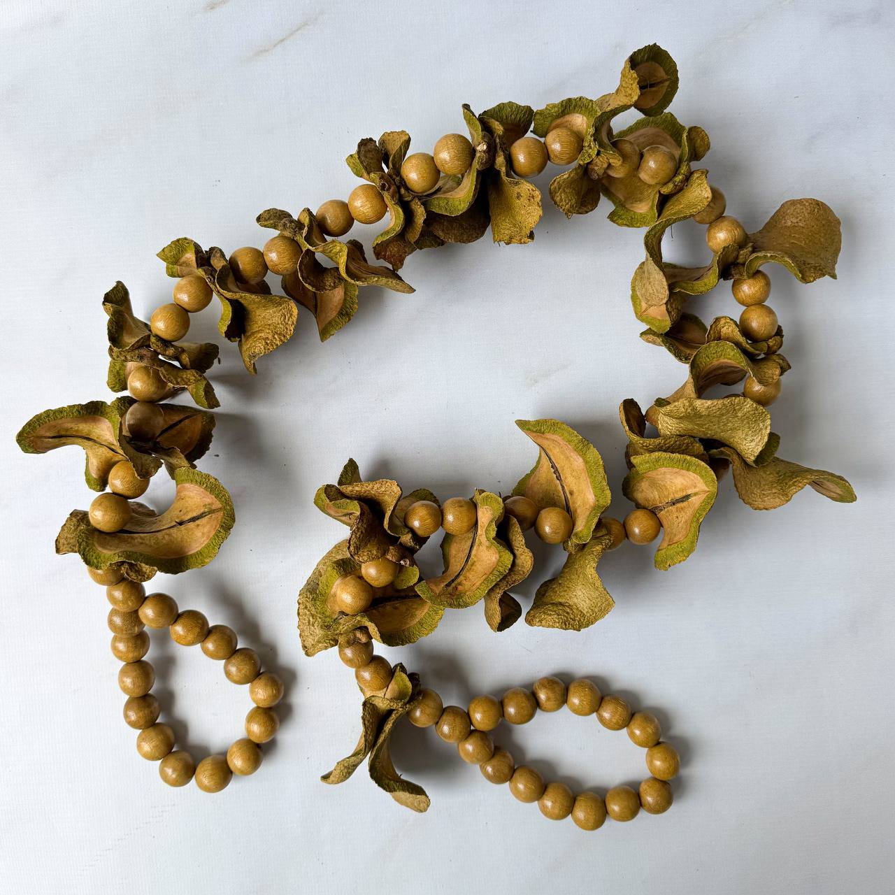 Este colar de mesa é uma peça decorativa artesanal com estética rústica e natural. Ele combina contas arredondadas de madeira clara com grandes elementos orgânicos feitos de pétalas secas — cascas ou sementes naturais — que formam volumes florais irregulares e cheios de textura.