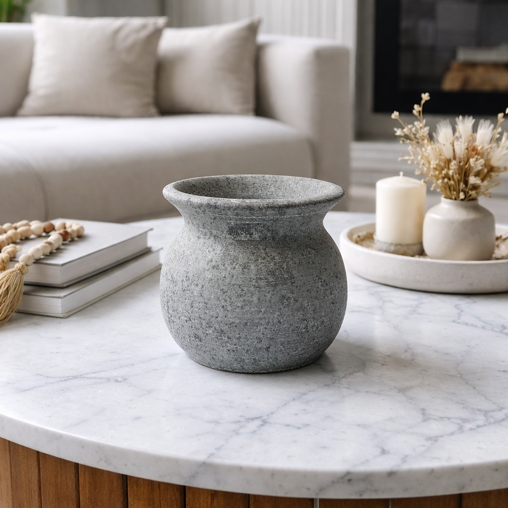 Vaso de pedra sabão esculpido artesanalmente, com design orgânico e atemporal. Seu formato arredondado, levemente abaulado, valoriza as curvas naturais da peça, enquanto a borda mais larga cria um acabamento elegante e sofisticado. A superfície apresenta textura suave, com variações naturais de tonalidade em cinza, características autênticas da pedra-sabão, tornando cada vaso único.
