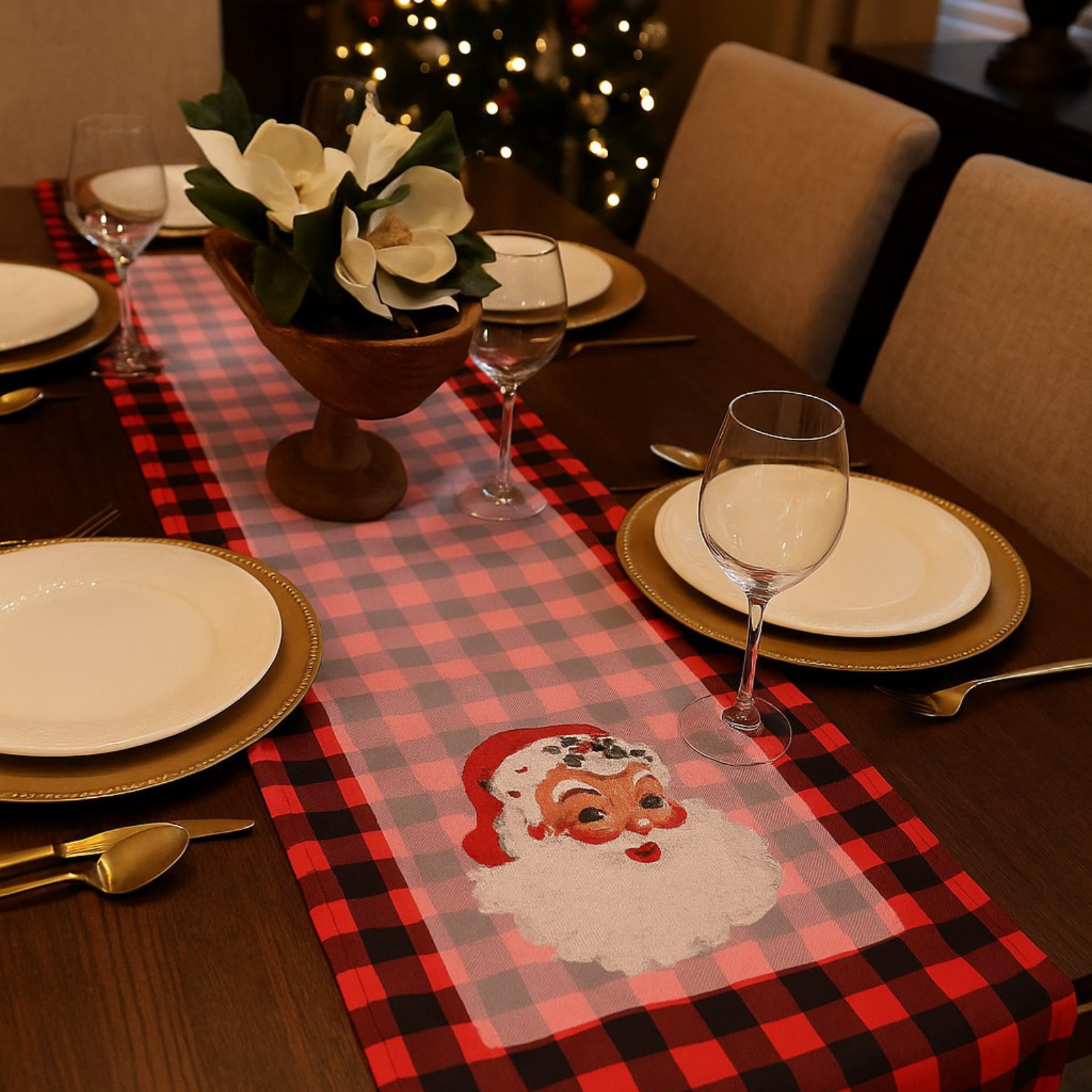 Leve o charme do Natal clássico para a sua decoração com este lindo trilho de mesa! Com estampa xadrez em tons de vermelho e preto e um adorável Papai Noel estilo retrô, ele é perfeito para criar um clima acolhedor e nostálgico na ceia ou em almoços especiais de fim de ano.