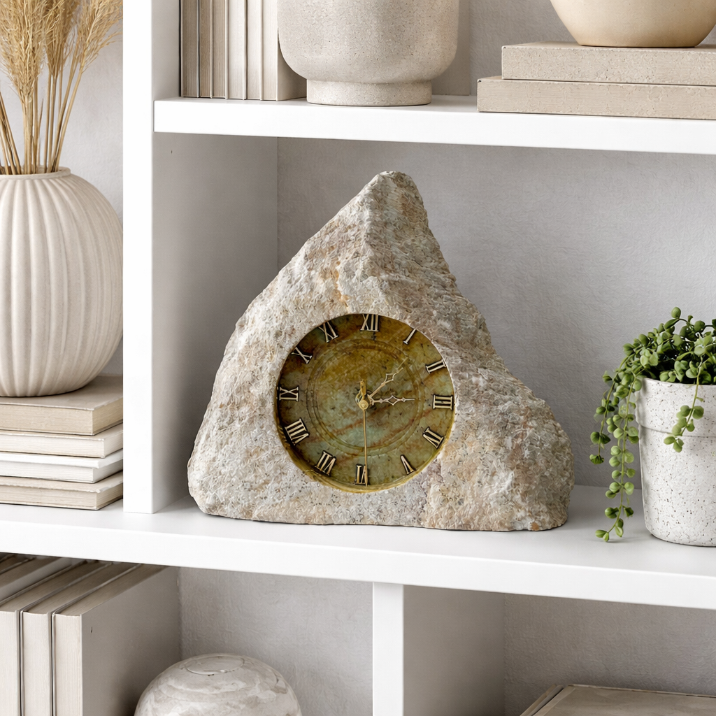 O mostrador circular é embutido na pedra e possui acabamento envelhecido e envernizado, com algarismos romanos em relevo que conferem um charme clássico e atemporal. Os ponteiros metálicos contrastam delicadamente com a superfície mineral, garantindo boa leitura e elegância.